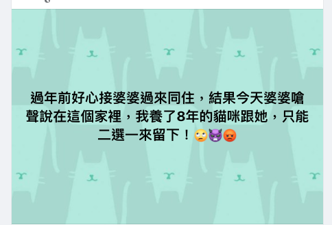 原來是因為這位人妻家裡養了一隻超過8年的愛貓,婆婆似乎是看不慣這隻貓,竟然直接嗆聲說:「貓咪跟我,只能二選一留下!」對於婆婆有這樣的言論,這位人妻也相當憤怒的留下了翻白眼的表情符號,只想忽略婆婆說的所有話題。