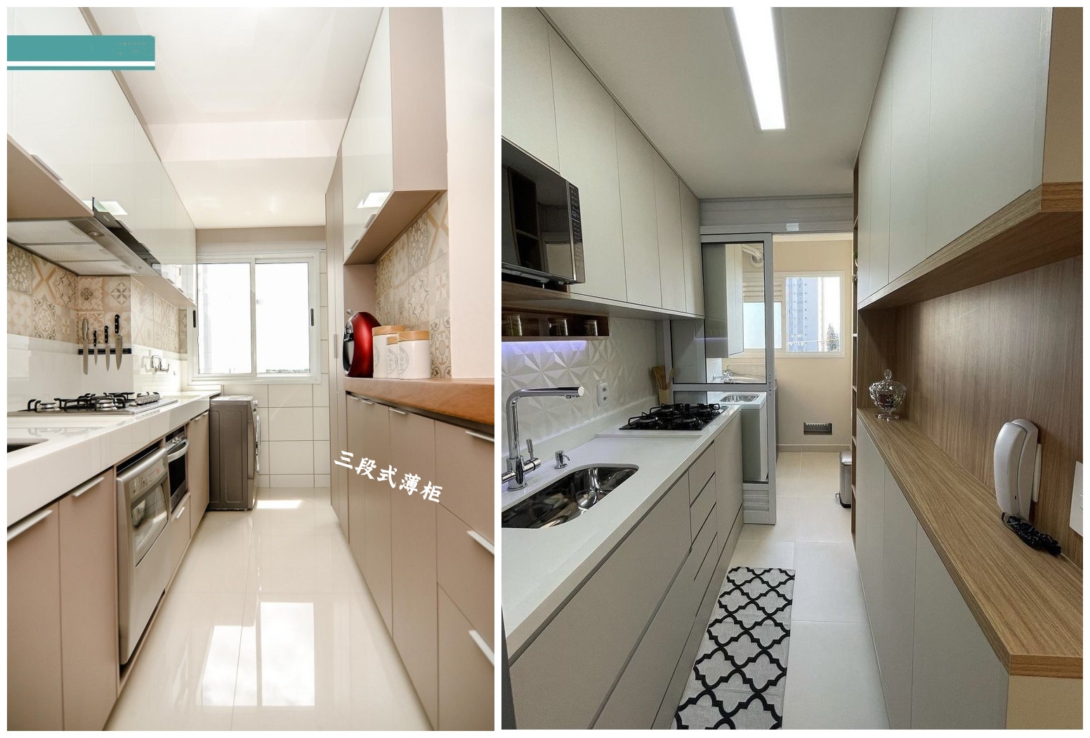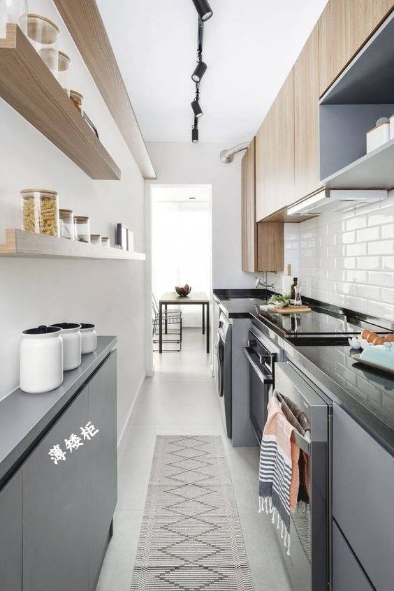 普通的櫥櫃進深60公分,對面牆壁也能嘗試定製薄櫃,進深30公分,上下分成三段式,不管是高度還是柜子的款式顏色都可以跟櫥櫃相統一,儲物空間又多又方便,沒油煙不潮濕,來不及收拾也不會凌亂尷尬,實用性拉滿。