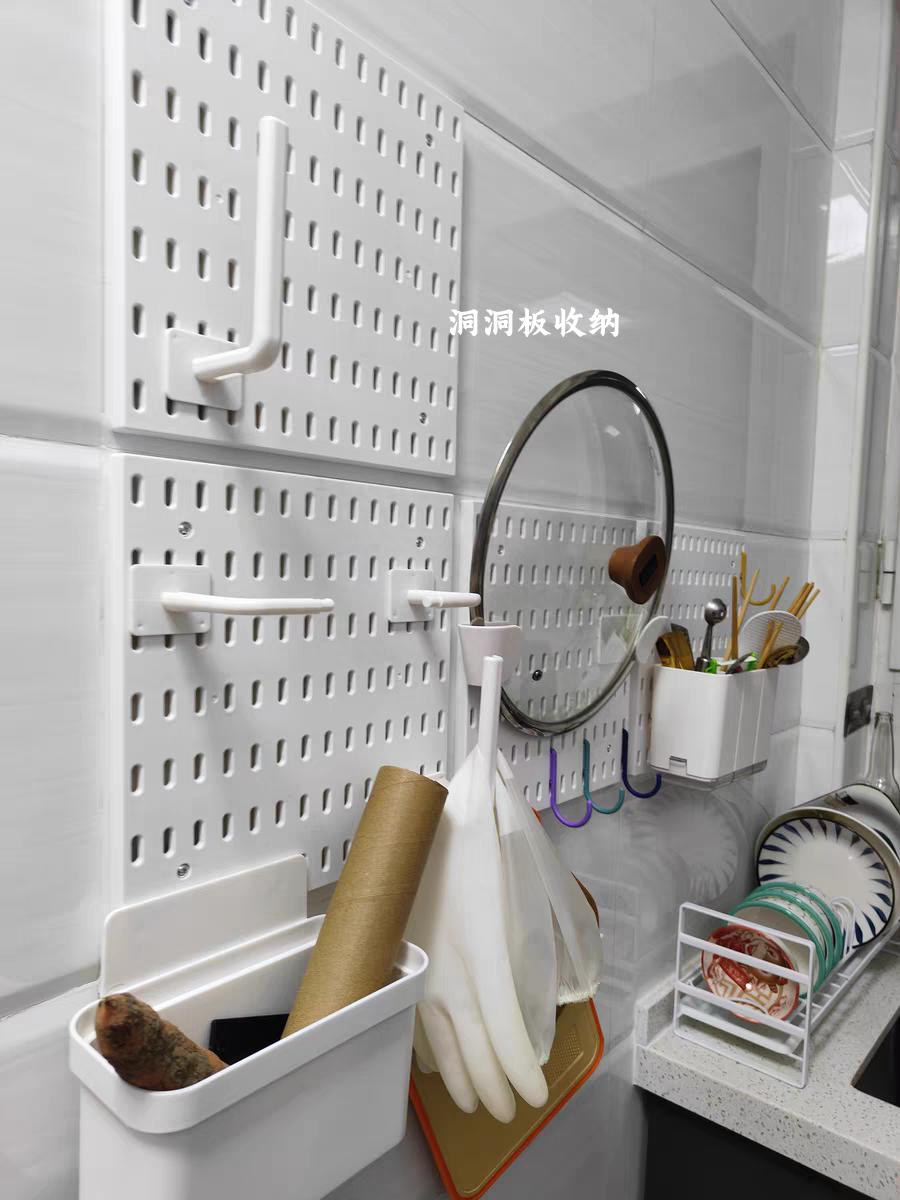 牆上固定一塊洞洞板,功能比柜子還要多樣化,可以掛些不常用的廚具、洗碗手套、圍裙等,搭配一塊隔板就能置物,高度位置都能隨便調,真的非常方便,價格不貴,安裝又不方便,最關鍵是不佔空間。