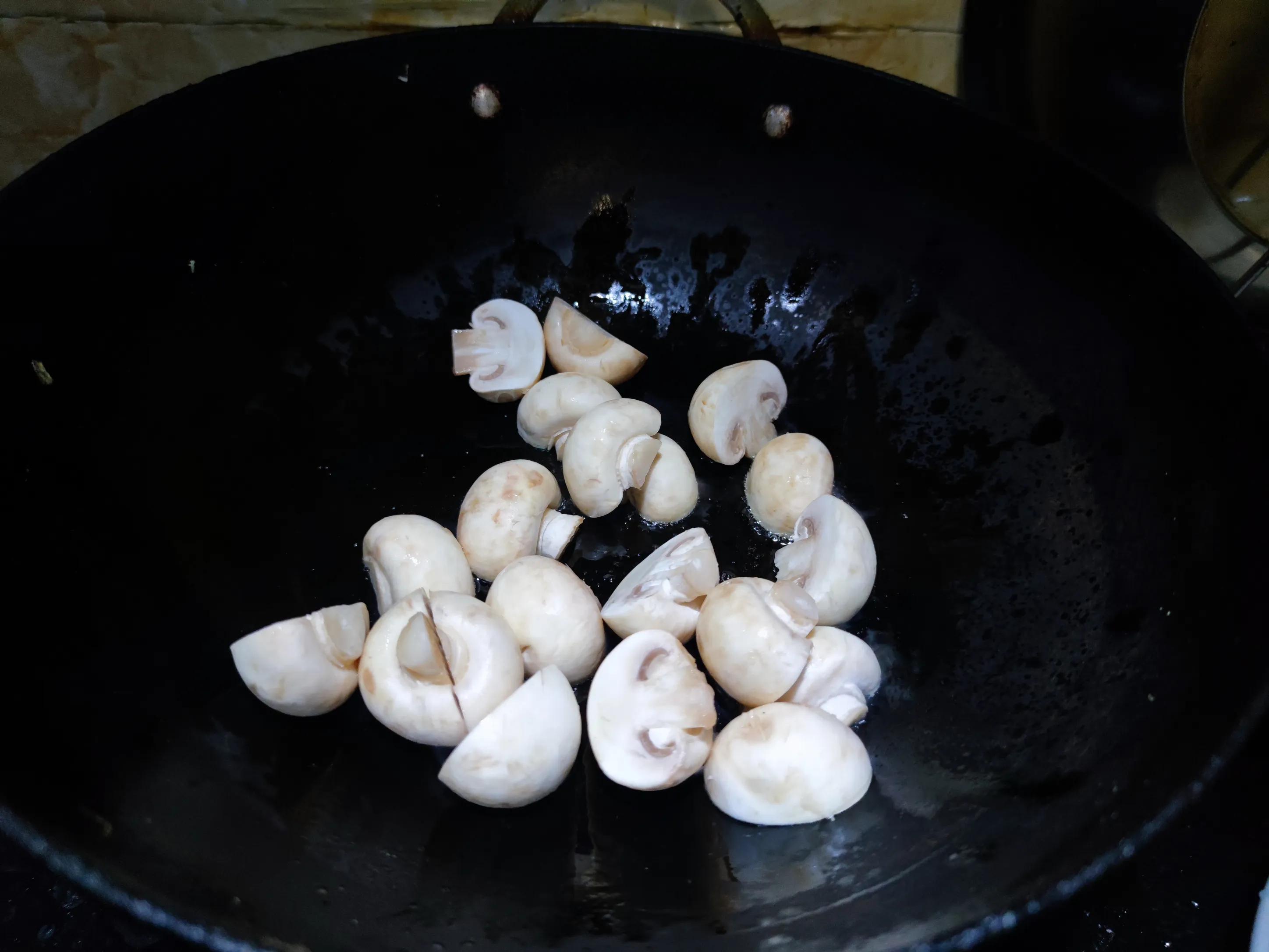 2.鍋中入油,下入口蘑煎出水分,煎至顏色金黃後盛出。