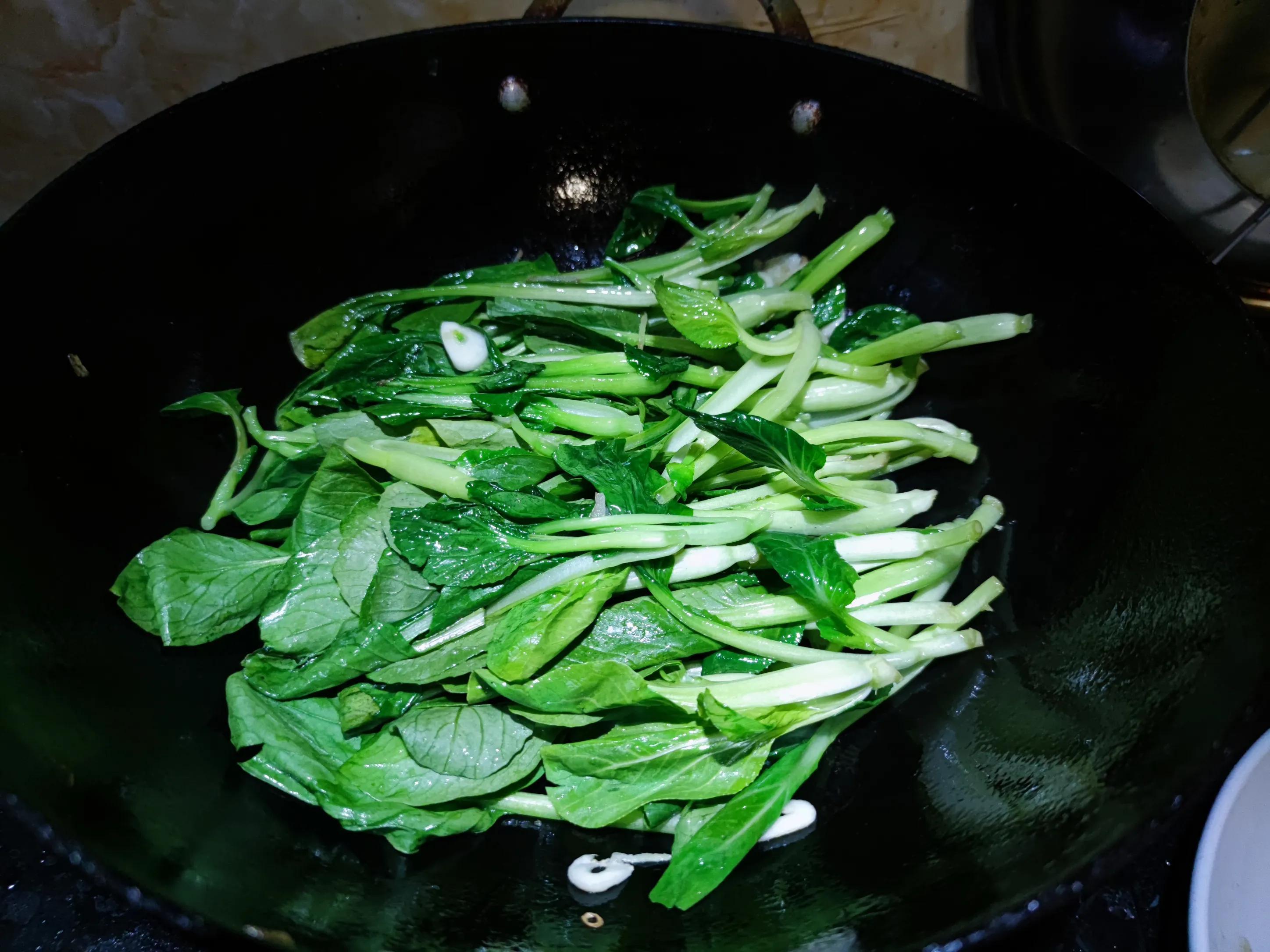 3.鍋中入油爆香蒜粒,下入油菜煸炒至顏色翠綠,烹入料酒後炒香。