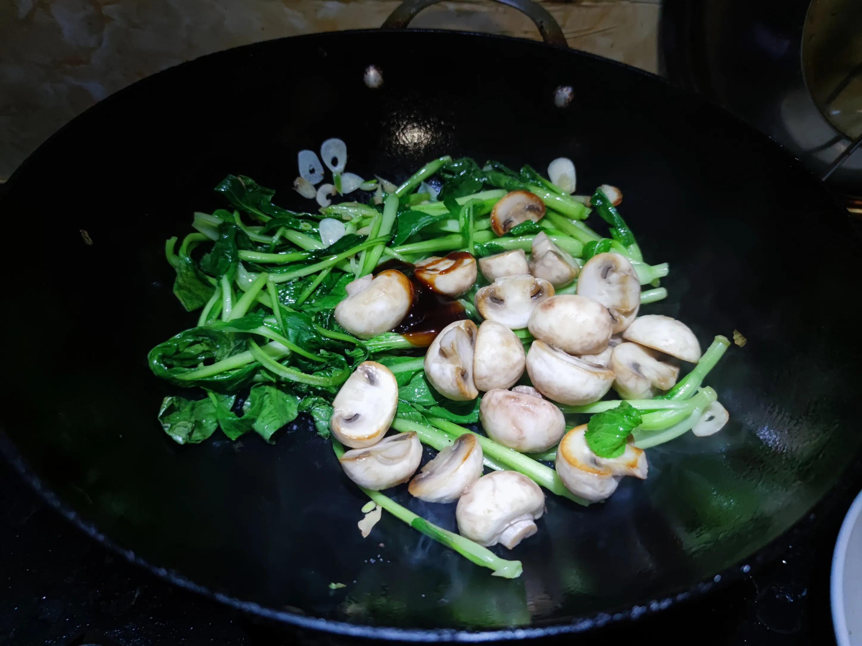 4.鍋中下入煎好的口蘑,翻炒均勻後加入鹽和蚝油調味,滴幾滴藤椒油即可出鍋。