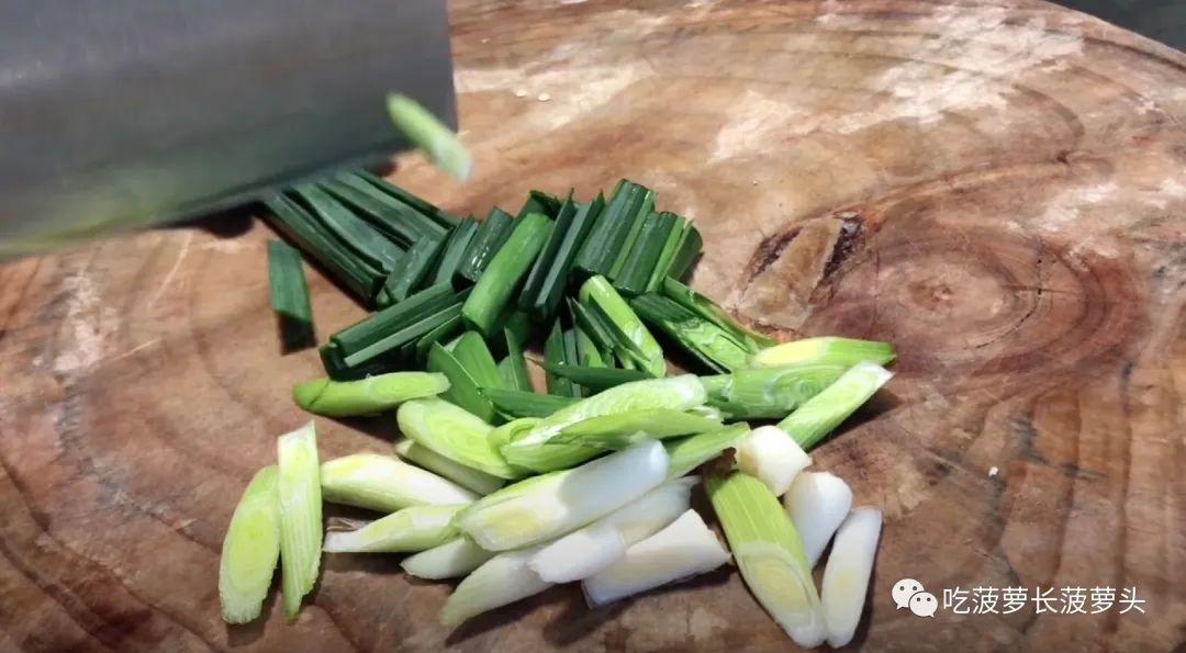 3. 切點蔥花姜蒜,小米辣切成小圈,紅椒切成薄片,青蒜苗切成小段。