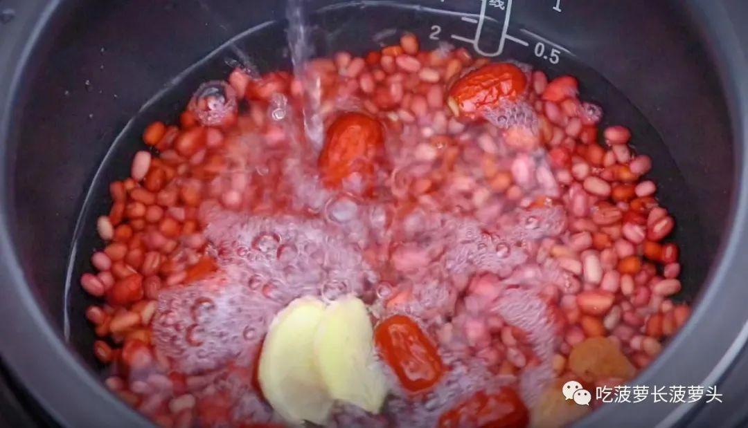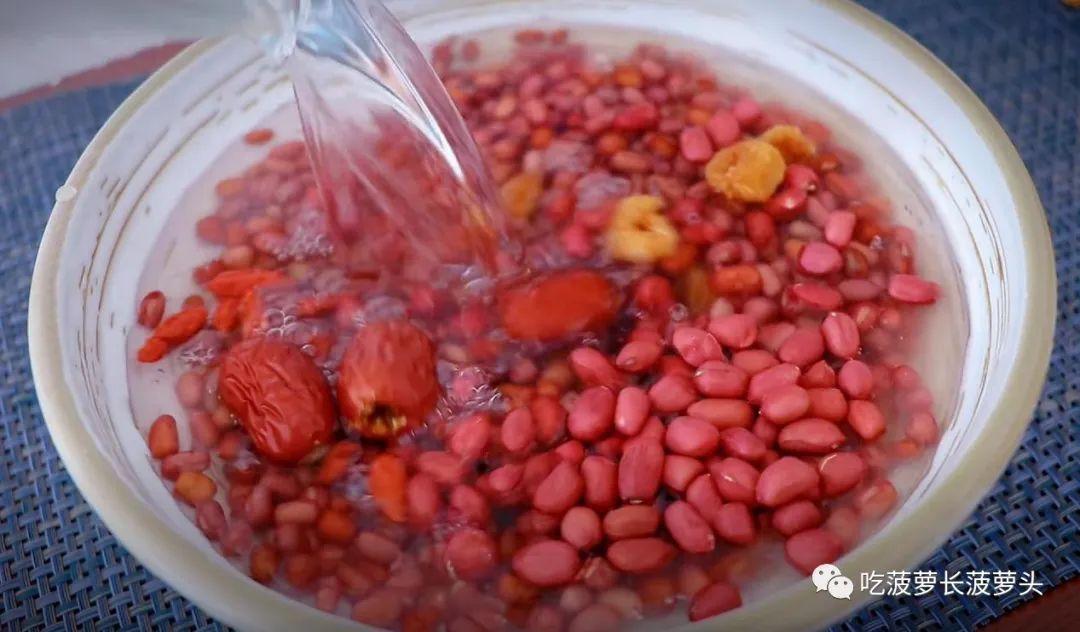 1. 紅豆提前用清水浸泡2個小時,再瀝干水分倒入盆中,加入花生、桂圓、枸杞和去核的大棗,倒入適量的水,反覆清洗幾遍,再控干水分備用。