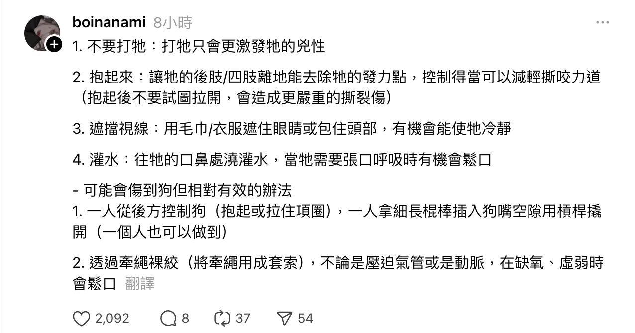 而此次事件也在社群平台Threads引發討論,專業的網友也分享如果遭到比特犬緊咬該如何處置,也希望民眾們下次若真的遇到緊急事件能盡快妥善逃離。