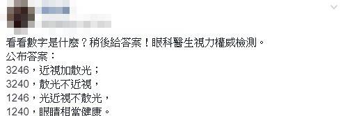 接著原PO也在貼文中補充答案,分別是「3246,近視加散光」、「3240,散光不近視」、「1246,光近視不散光」、「1240,眼睛相當健康」。