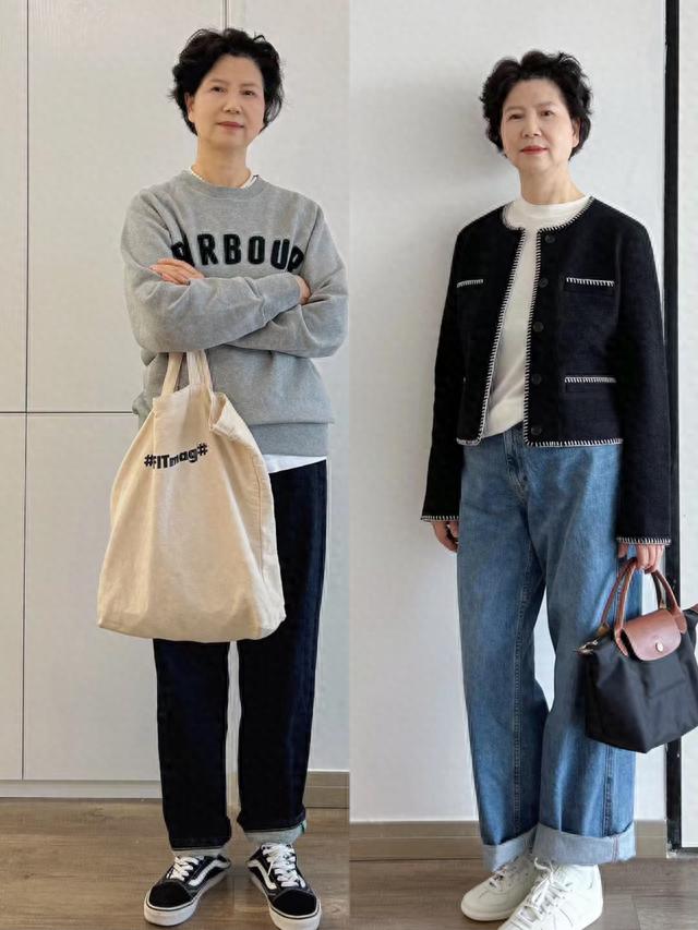 相對而言闊腿褲就有更強的修飾性,四五十歲的年紀,哪怕自己的身形比例不是很完美,都可以選擇寬鬆且具有包容性的闊腿褲。寬鬆的牛仔闊腿褲,搭配挽褲腿的設計,更加俐落大方。牛仔闊腿褲,也會表現出一種更年輕的狀態。配小白鞋,特別的清爽時髦。