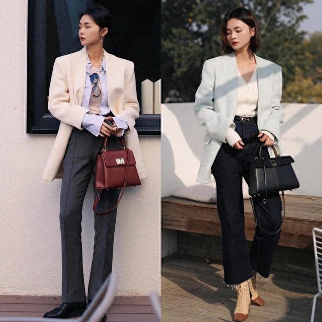 這種穿著方式,有一種更加俐落大方的美。如果腿型比較優越,我們可以嘗試搭配相對修身的褲型,深色系修身的長褲,不僅顯高還特別顯瘦。