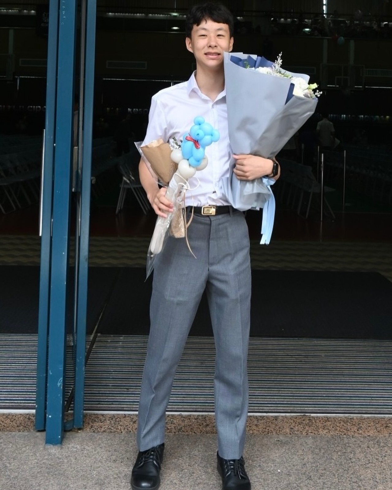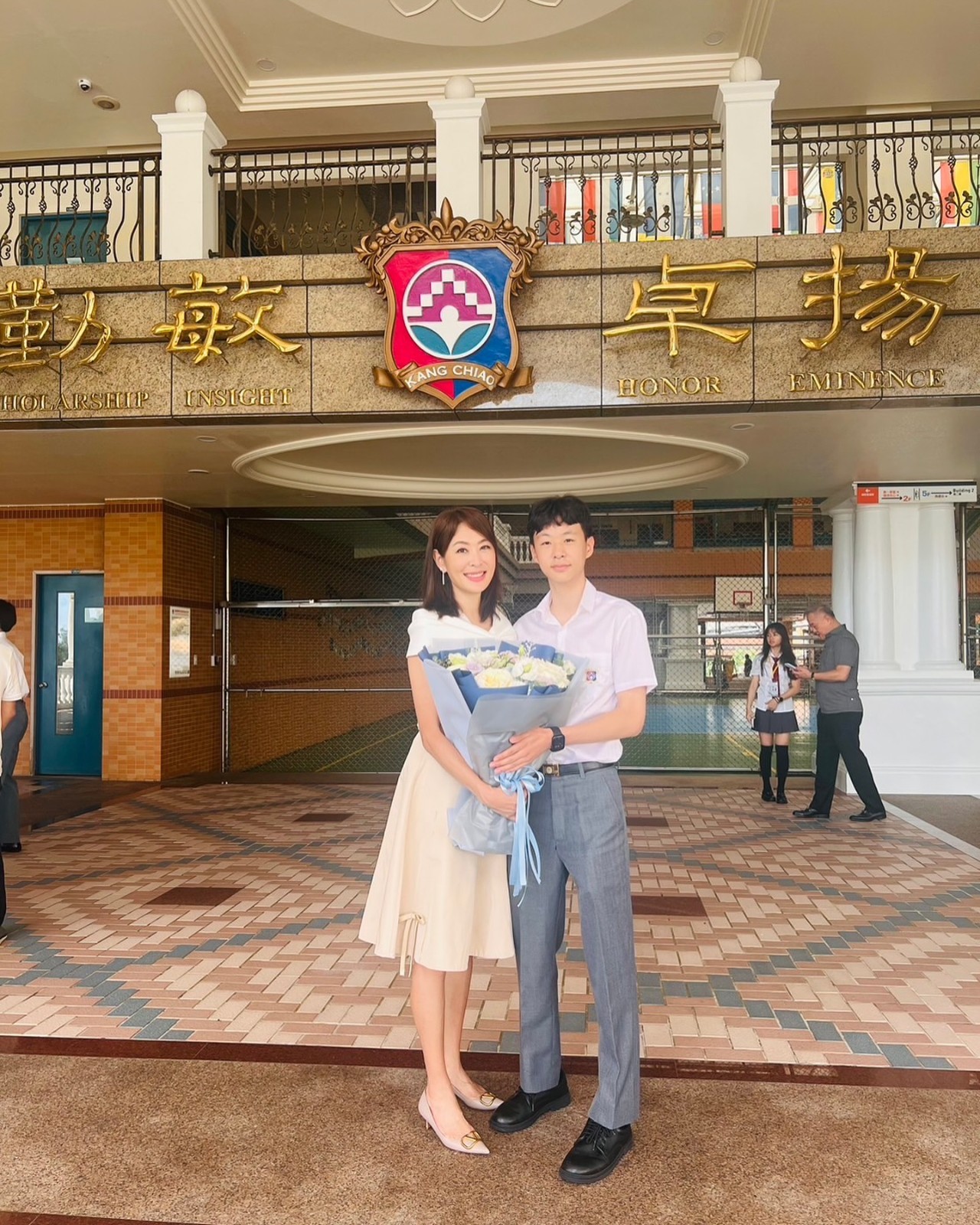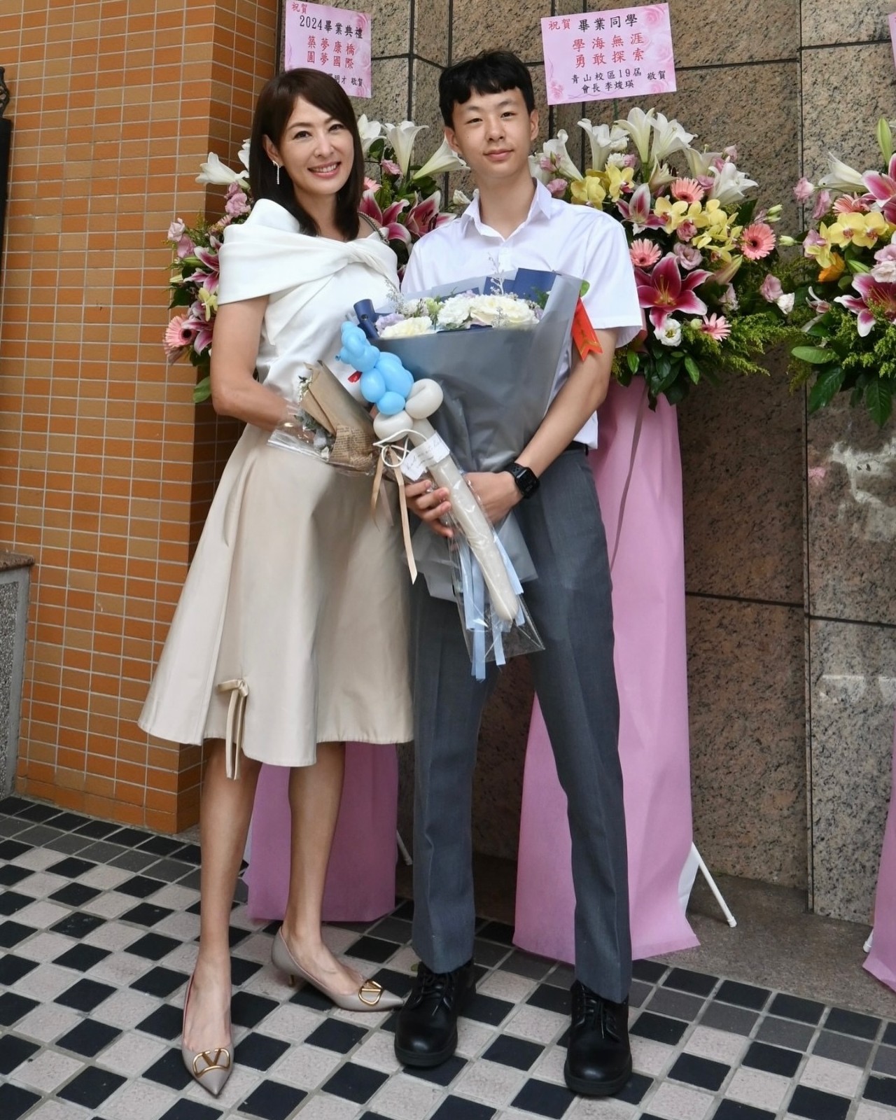 畫面中,兒子穿著白制服、灰西褲,賈永婕則身穿白色露肩上衣、米色裙子,氣質高貴優雅,母子倆同框畫面宛如姊弟,她開心喊:「歐巴兒子好帥~畢業快樂~」也不忘在老公和女兒曬出的旅遊照吐槽:「你們看起來一點也不好玩!」、「不好吃。」