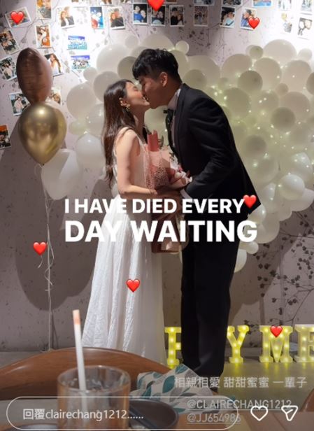 只見未婚夫單膝下跪,在貼滿兩人回憶照、眾多愛心氣球前,告白說:「我會繼續地一直愛妳,妳願意嫁給我嗎?」一旁友人紛紛起鬨大喊:「嫁給他、嫁給他!」她感動並堅定地說:「我願意!」