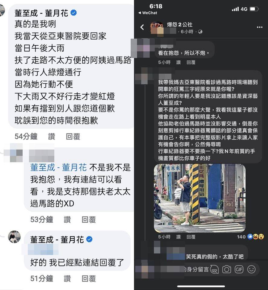 沒想到這篇PO文更釣出董至成本人親自回應,他也客氣表示:「真的是我咧!當日午後大雨,扶了走路不太方便的阿姨過馬路,當時行人綠燈通行,因為她行動不便,下大雨又不好行走才變紅燈,如果有擋到別人跟您道個歉,耽誤到您的時間很抱歉。」