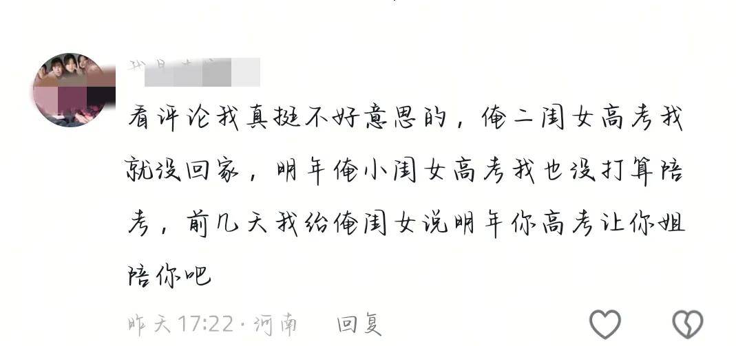 還有人坦言:「我去年也沒回家陪女兒高考,是她姐陪她去的,今年小女兒高考,我還在外頭,她們姐倆自己安排,我心裡真是說不出的愧疚。」