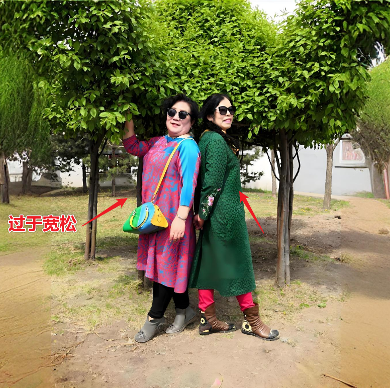 比如下面這個穿旗袍的阿姨,因為旗袍的尺寸沒選好,不僅暴露了自己的大肚腩還因過於勒肉而顯得不夠美觀得體。