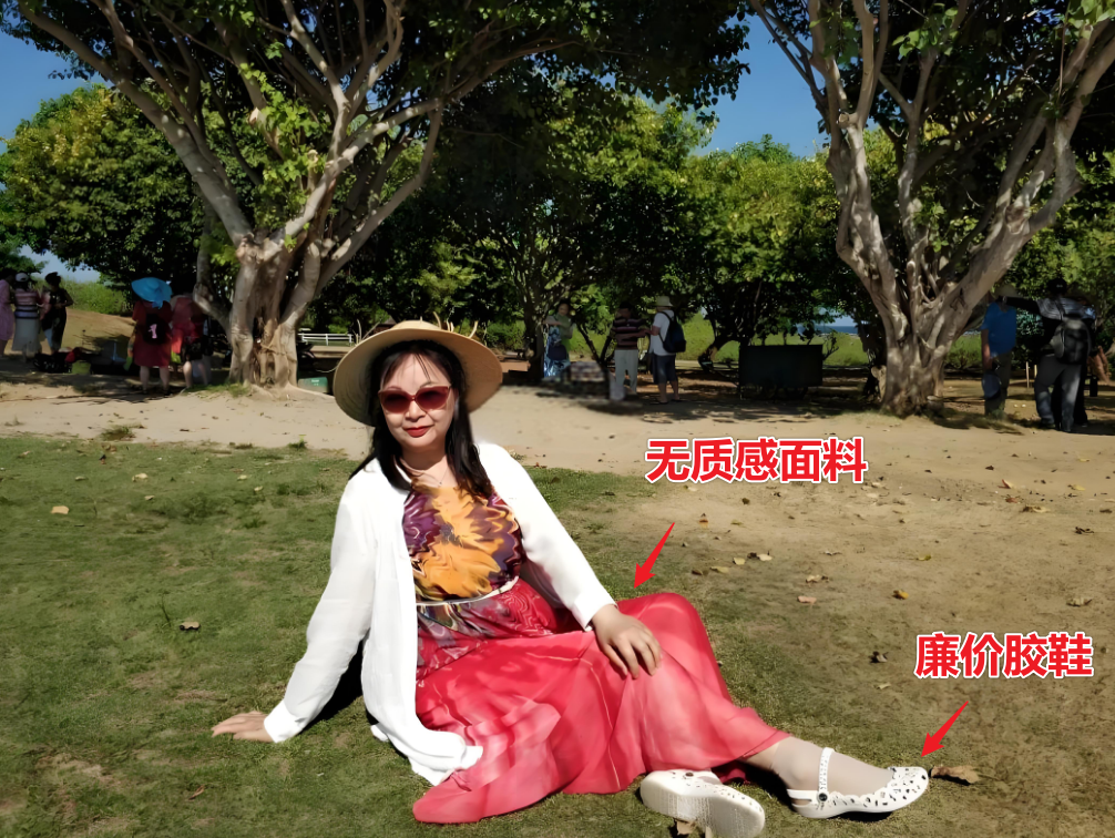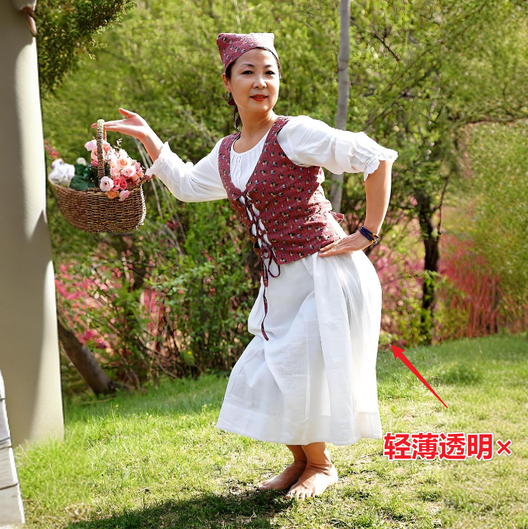 便宜的裙子料子一般都十分輕薄甚至透明(陽光下照射下會暴露隱私,幾乎一覽無餘),這種裙子不僅缺乏質感,給人一種粗糙、不精緻的感覺還難以體現中年女性的品味和修養。