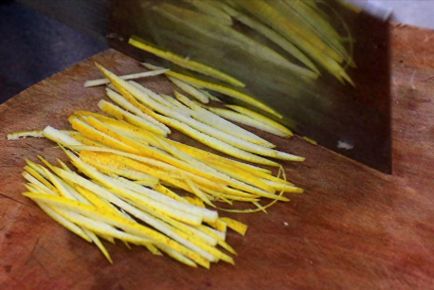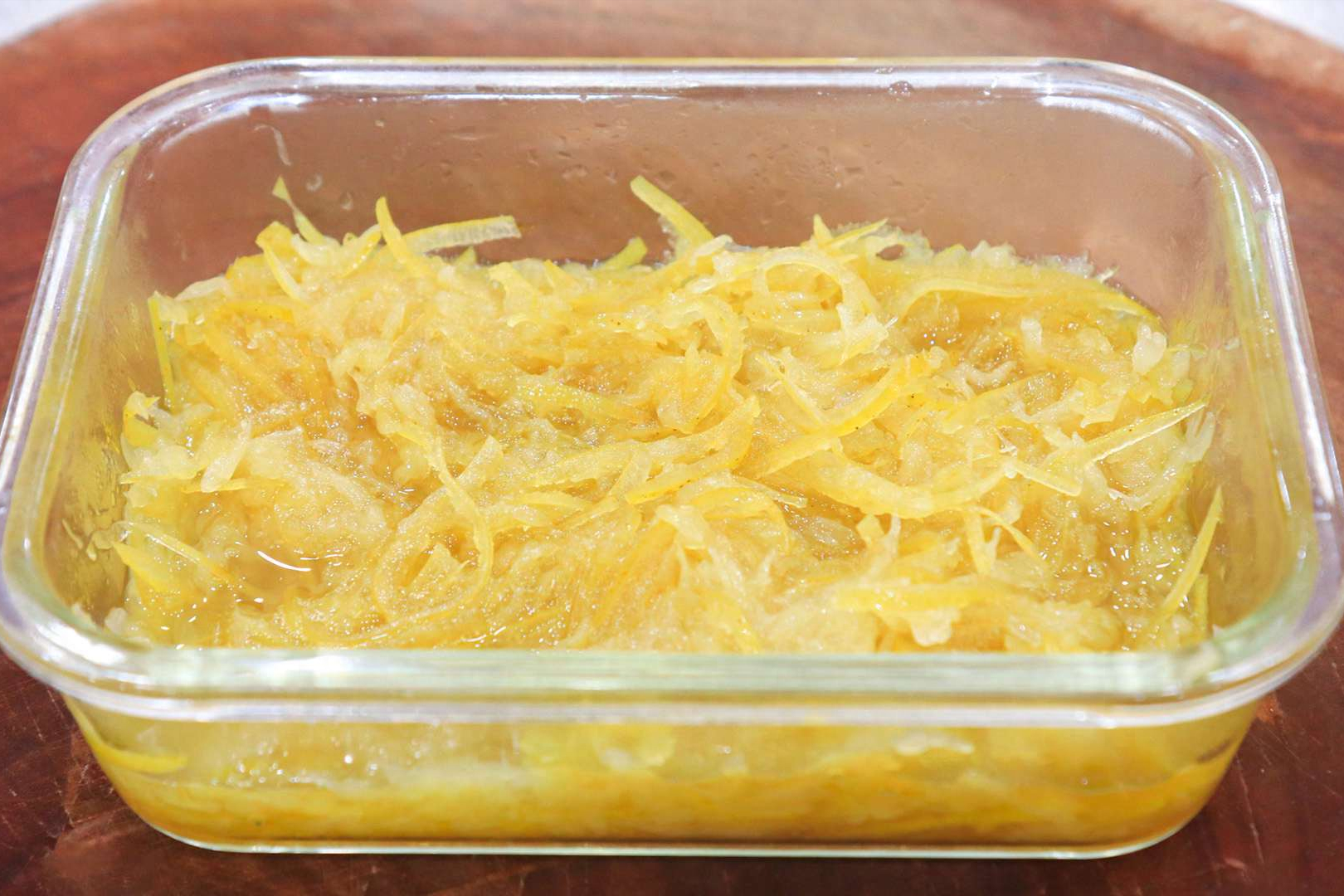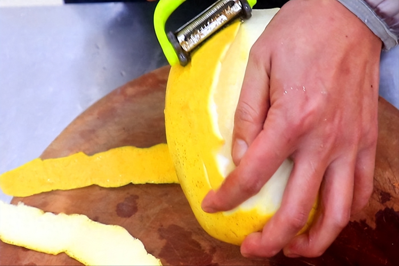 1.準備一個新鮮的柚子,用食鹽把柚子皮搓洗一遍,然後用清水沖洗乾淨,把柚子黃色的表皮全部刮下來。