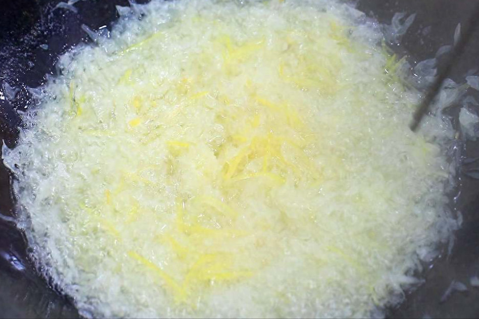 3.鍋內燒水,把柚子皮放入沸水中焯一下水,去除裡面的苦澀味,大約煮30秒鐘倒出來控水備用。鍋內倒入開水,放入果肉、冰糖和柚子皮,大火把冰糖熬化,轉為小火繼續熬煮40分鐘。