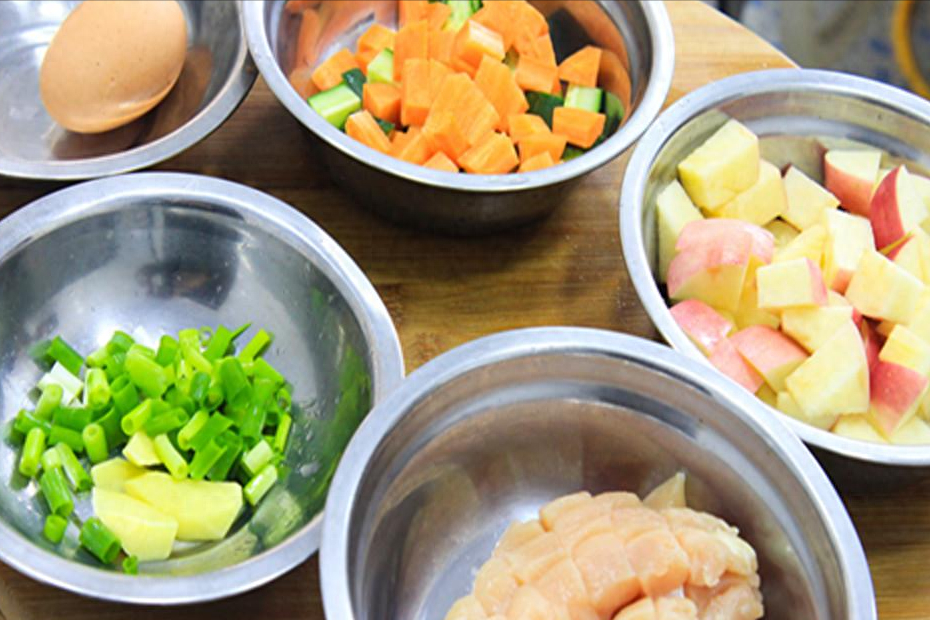 1.雞胸肉一塊洗凈後片開,切成小丁,加鹽、料酒拌勻腌制10分鐘;打入一個蛋清、抓入一小把澱粉繼續拌勻增加滑嫩感;蘋果去核、切成丁;再切點黃瓜丁、胡蘿蔔丁配色;另外準備點蔥花備用。
