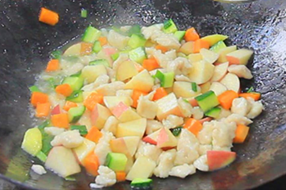 3.鍋內燒油、油熱以後放入蔥花炒香,放入雞丁、胡蘿蔔丁和黃瓜丁繼續翻炒,加入食鹽2克、雞粉2克、胡椒粉1克、白糖3克、雞汁2克,翻炒化開調料,最後放入蘋果丁翻炒均勻,勾入少許水澱粉使食材和調料更好的融合,淋入明油提亮色澤,翻勻後即可出鍋裝盤。