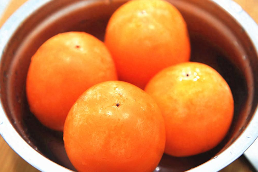 1.準備幾個成熟的柿子,把外皮剝乾淨,挖出裡面的柿子肉放入盆中。