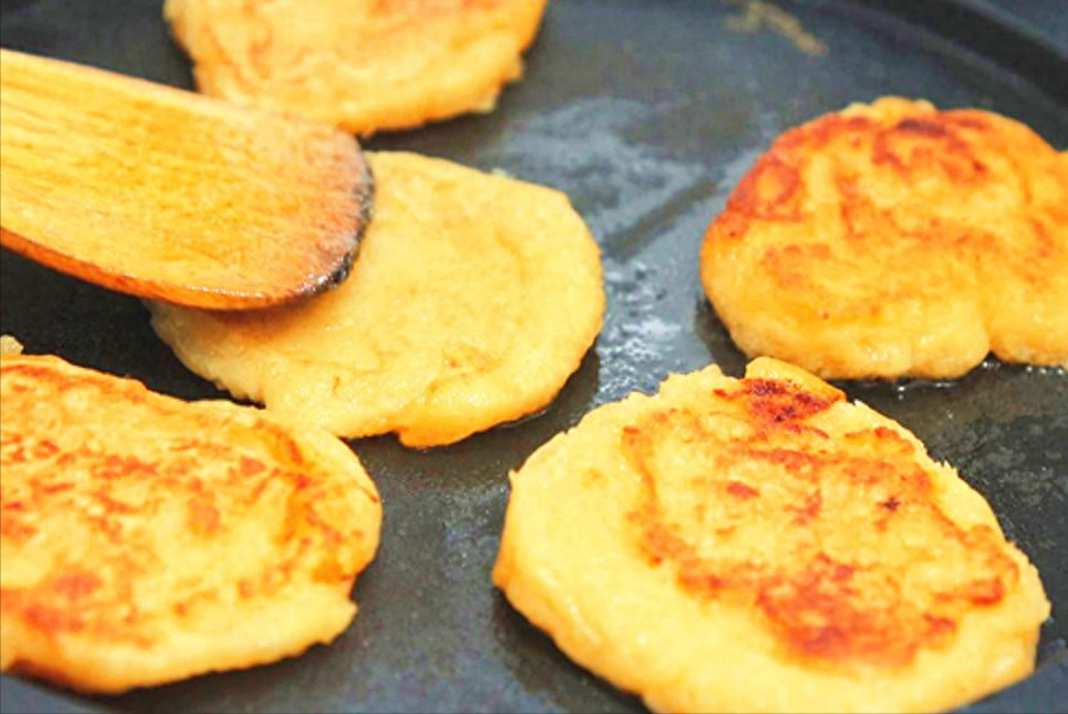3.電餅鐺燒熱,均勻刷上植物油,挖一勺麵糊放入鍋中攤成圓形的小餅,定型以後輕輕地翻下面。