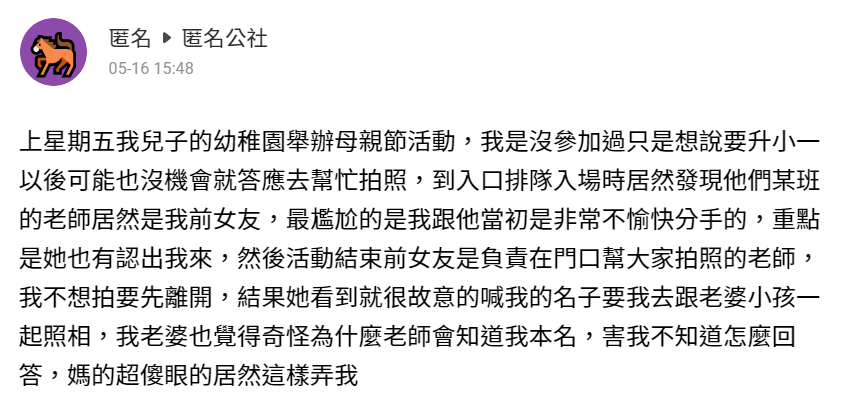 也有人認為既然原PO都已經結婚生子,有什麼不好跟老婆說的,「該不會是你當初對不起人家,所以才不敢跟老婆坦言的吧?」,還有同樣有類似際遇的苦主跳出來分享:「台灣真的很小啦,我前妻的妹妹是我現在主管的太太,尾牙看到差點嚇死」。