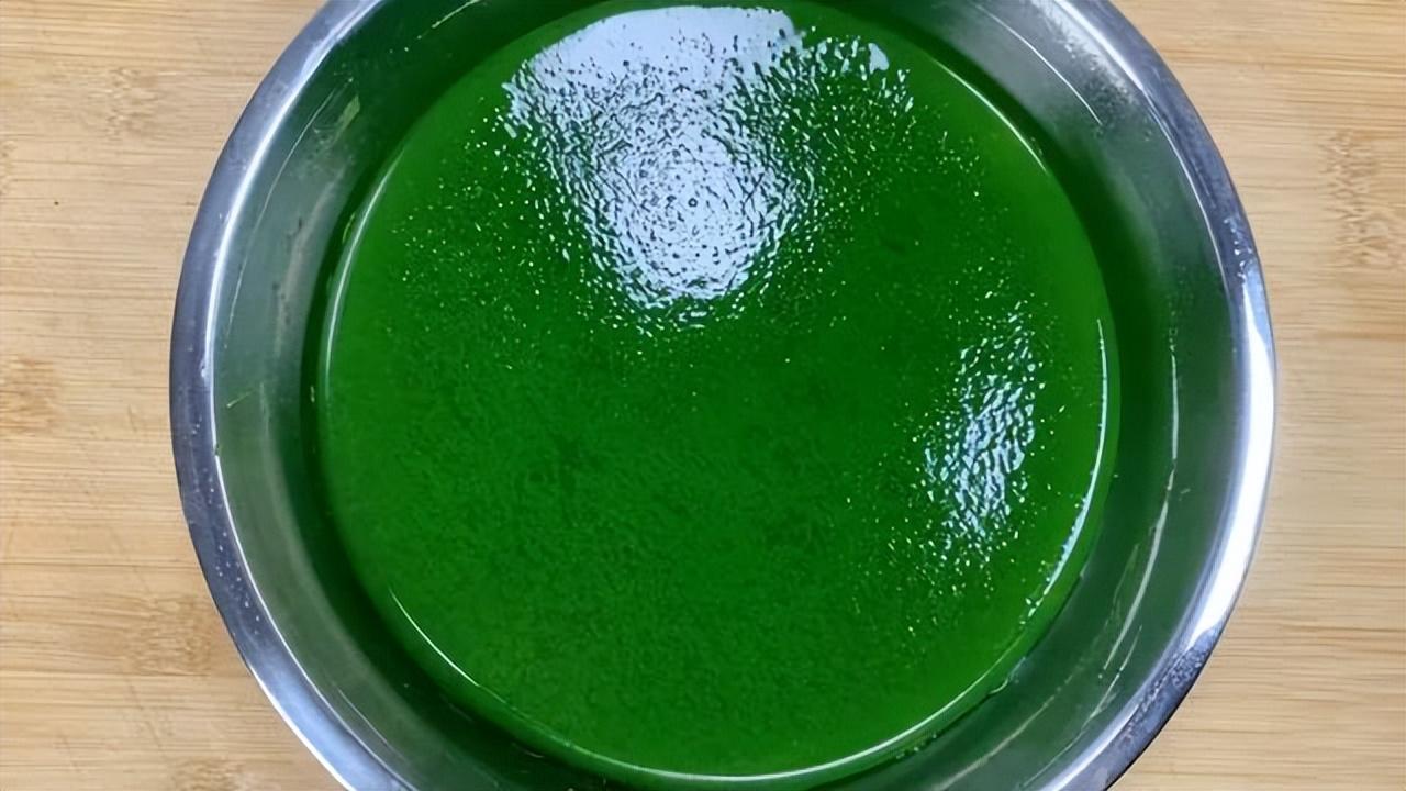 取一隻乾淨的空盆,用刷子在盆的輕輕表面刷一層食用油,將熬好的艾草汁倒入盆中自然晾涼,如果著急食用,可以把盆上面封上一層保鮮膜,放入冰箱冷藏一會兒后取出。