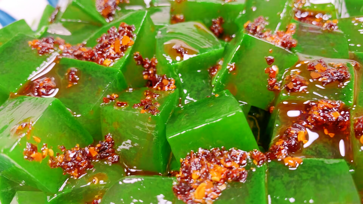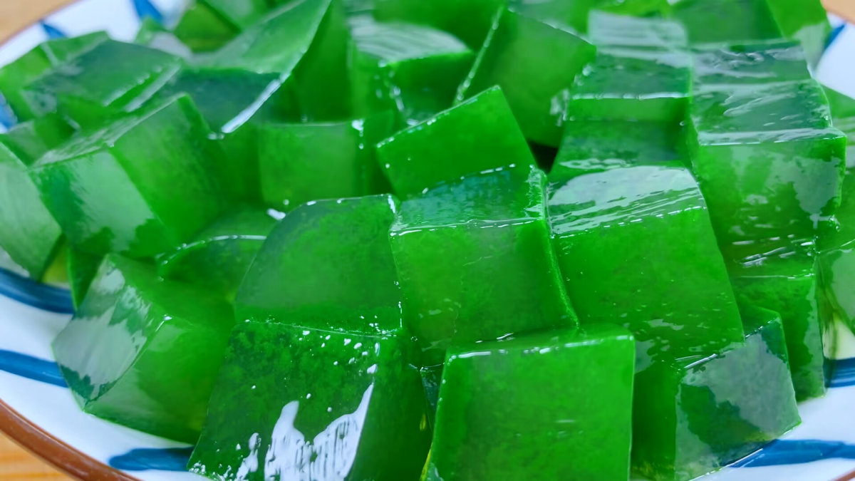 艾草汁放置涼透後,用手輕輕按壓表面,待艾草汁完全凝固后,把盆倒扣在菜板上,將製作好的艾草涼粉扣出,用刀切成大小適中的小塊,然後盛入盤中。