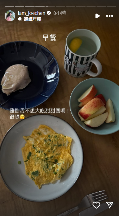 陳喬恩公開分享了體重計上的數字—47.42公斤,只差1公斤就能回到10年前的體重,對此她也感嘆10多年前無憂無慮大吃大喝,都不必擔心體重上升,讓她不禁直呼:「難道我不想大吃甜甜圈嗎!很想。」而陳喬恩也分享了自己的健康飲食清單,早餐搭配為雞胸肉、蔥蛋、蘋果,再配上一杯檸檬水。雖然菜單看起來清淡,但營養均衡,充分展現她對身材管理的用心。