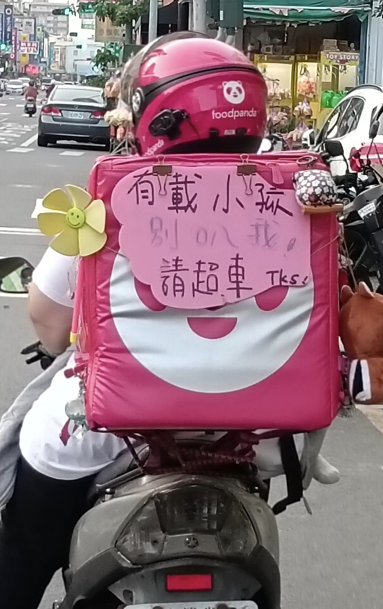 據《三立新聞》報導,該名網友在臉書「路上觀察學院」分享照片,短短一天就湧入1萬多個讚、7百多則留言,畫面裡,外送員騎著機車跑單,後面的外送箱用黃色小花和布偶裝飾,引人注意的,卻是貼在箱子上的塑膠板,上頭寫著:「有載小孩,別叭我!請超車,Tks(Thanks謝謝)。」原PO也補充說明,原來這位外送員媽媽,胸前背著一個小寶寶。