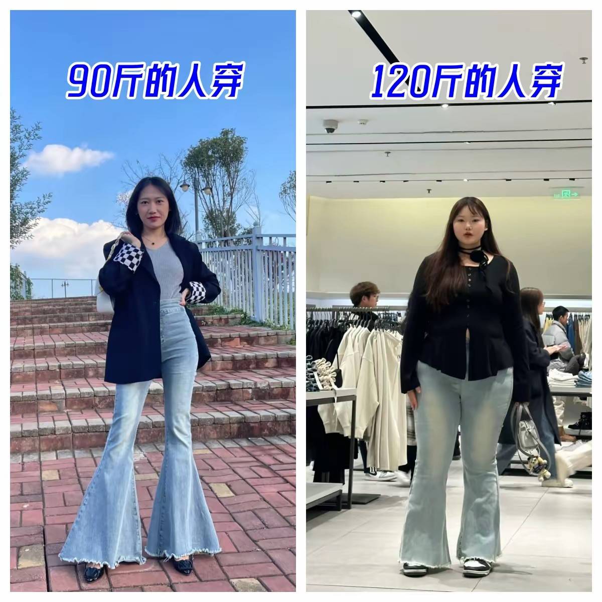 同樣都是喇叭褲,體重45公斤和體重60公斤的女人穿起來,對於也是相當的慘烈。
