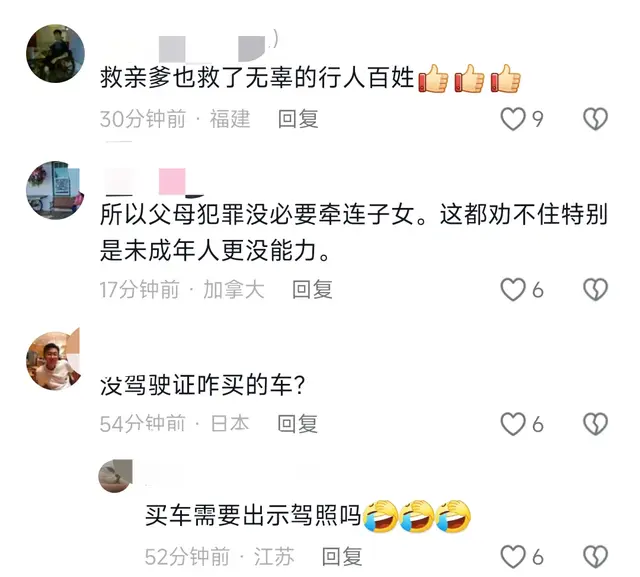 看來,這是一位愛車如命的父親,他不僅不顧自己的安危,甚至也不顧公共場合下廣大人民群眾的安危。無證駕駛,可千萬要不得。