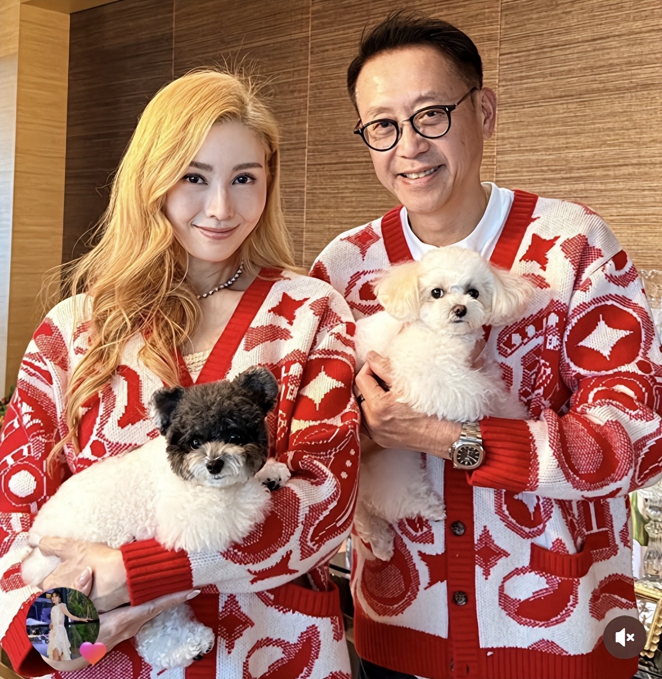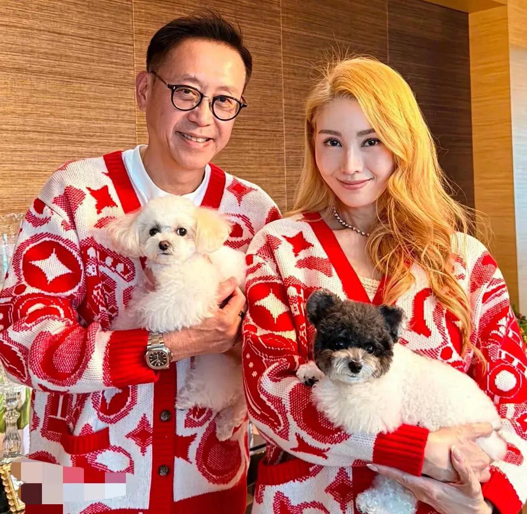 55歲的李嘉欣在2026年馬年春節現身香港,頂著一頭搶眼的金髮,和丈夫許晉亨穿著紅白情侶裝,各自抱著一隻寵物狗在豪宅曉廬合影拜年,畫面喜慶又溫馨。