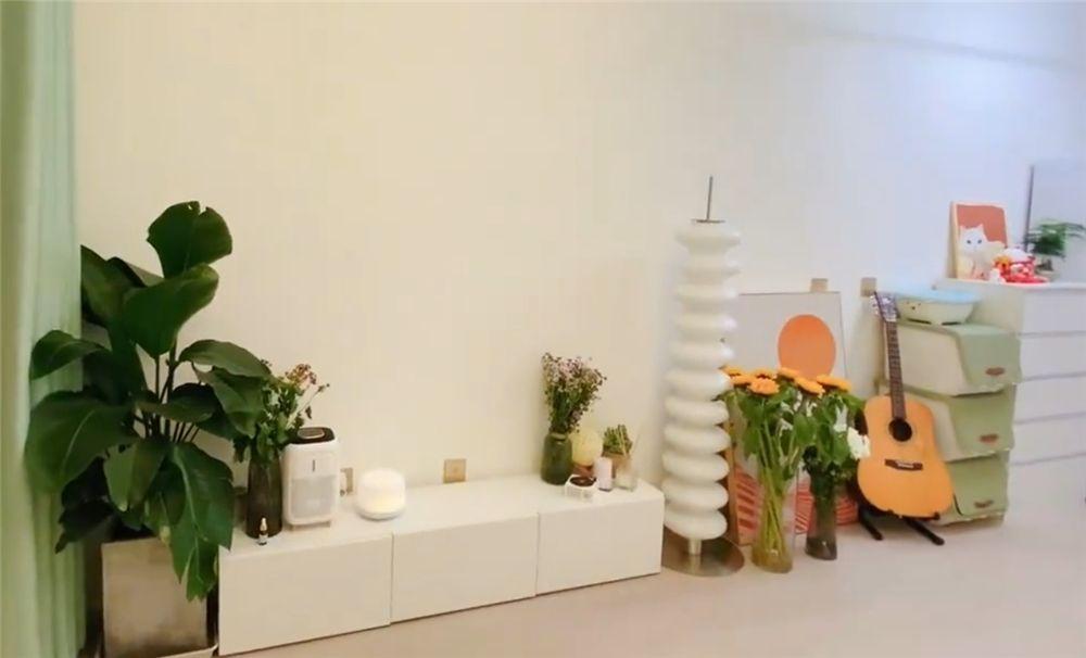 電視牆一側,電視櫃、綠植、收納櫃,共同組成一幅「小清新」的畫卷,看上去頗具溫馨素雅的質感。