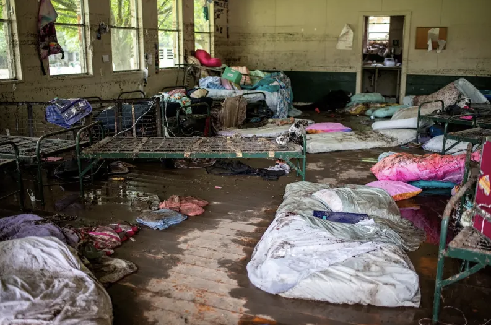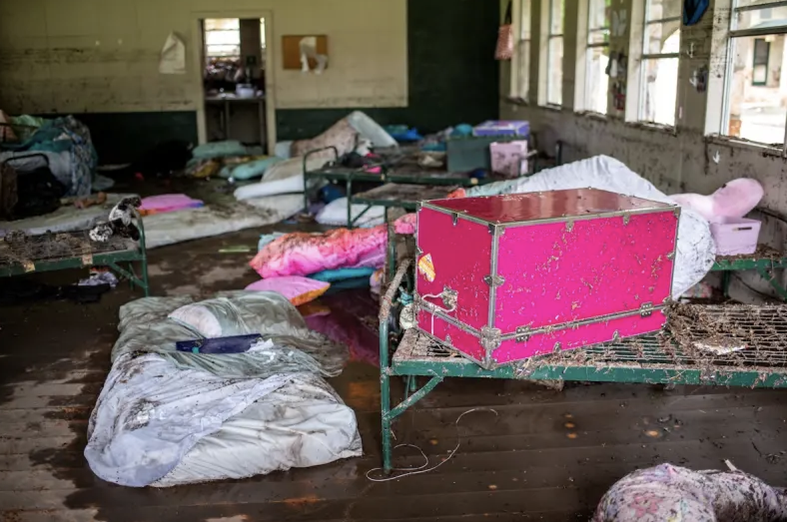 災後現場一片狼藉,營區餐廳外牆完全消失,室內空無一物,周邊草地散落著被沖走的餐具,女童們居住的小木屋更是慘不忍睹,床墊凌亂地散落在地,寢具沾滿泥濘,金屬床架東倒西歪,從屋內痕跡能看到,洪水高度曾達到窗戶中央,甚至逼近門口高度!