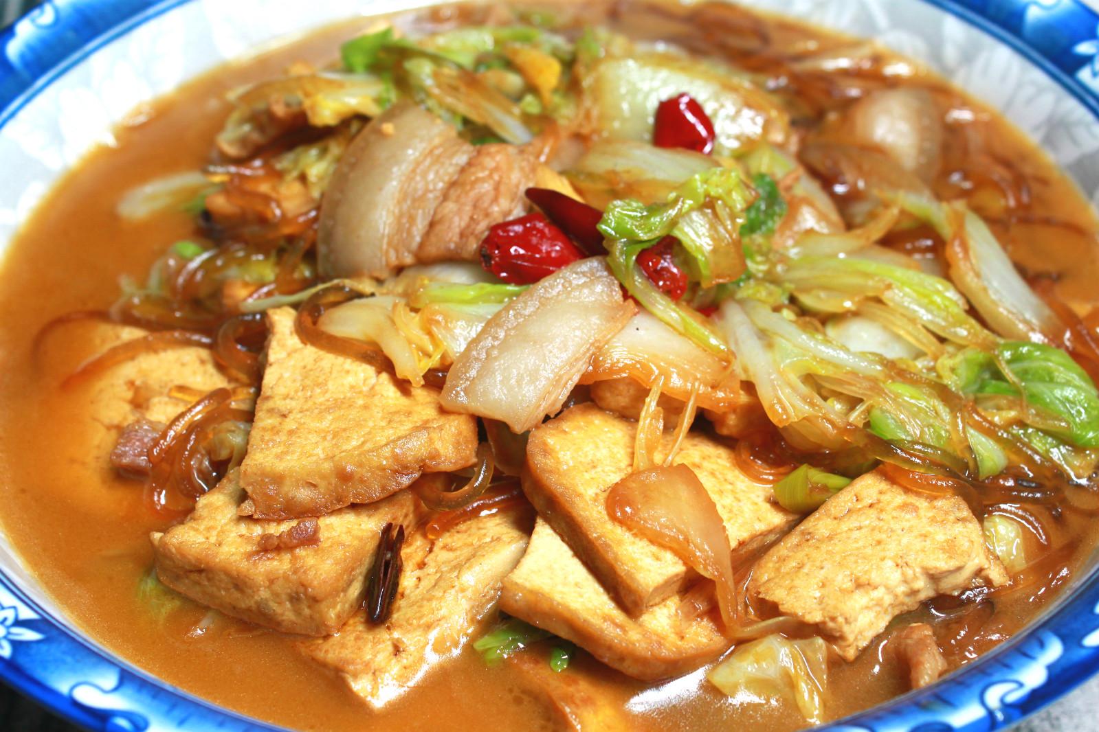 3,鍋裡多來點油,油熱後把豆腐煎一下,這樣燉的時候不容易爛,晃動一下鍋,讓豆腐受熱均勻,微微金黃就可以了,不要煎的太硬了,煎好之後裝盤備用。一小塊略肥點的五花肉切成薄片,五花肉可以提前凍一下,這樣好切些。