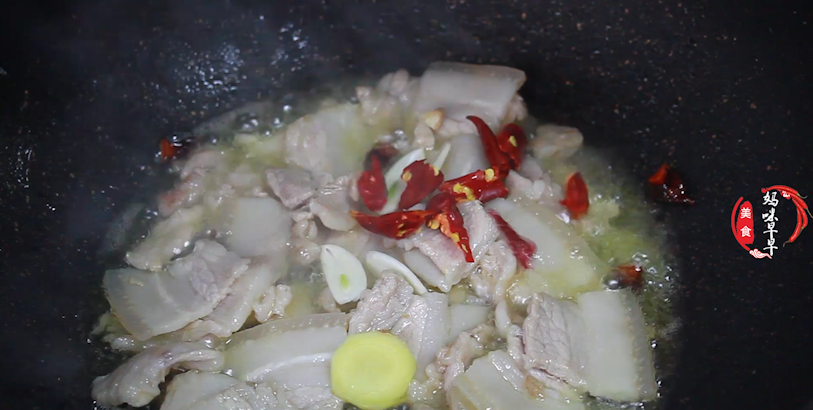 5,熱鍋涼油下入五花肉,這樣不會粘鍋,先把肉炒到顏色發白,然後加入2顆掰碎的八角,這樣炒出的肉特香,把八角的香味炒出來,然後加入料酒、蔥薑片和干紅辣椒,繼續煸炒,把肥肉的油完全煸炒出來,這樣吃著就不膩了。