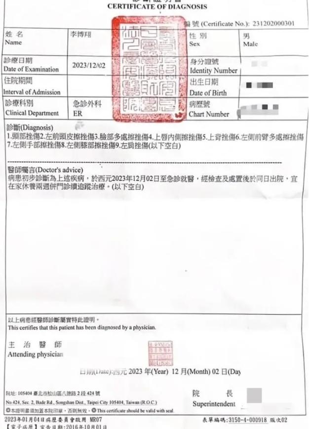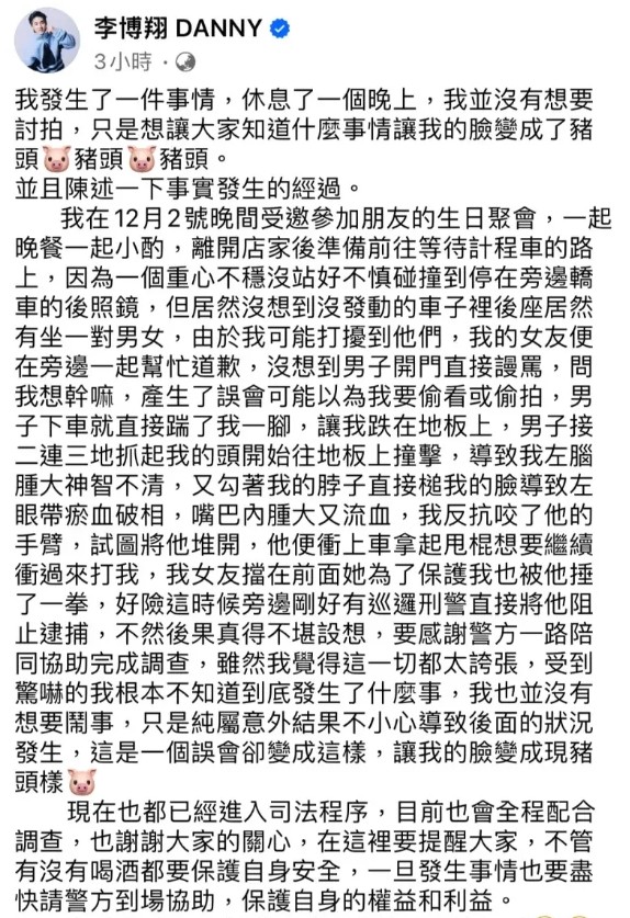 臉腫破相!34歲本土男星驚傳「遭路人痛毆」嚴重傷勢曝光 錯愕喊:「一個小誤會竟釀禍」 Elmo 2023-12-05 檢舉 還好當時有員警巡邏,才上前阻止這個暴力行為,李博翔直呼很感謝警方協助,當時自己完全被嚇到了,根本不知道發生什麼事情,猜測可能是誤會才會這樣,不過後續也已經進入司法程序,也都會配合調查,更呼籲粉絲,在外面一定要保護自己的安全。 Advertisements 影片來源:TVBS選新聞天啊太誇張了,不過就是不小心跌倒,居然會惹來傷身之禍??資料來源:《ETtoday》 Advertisements 回首頁 2/2 Advertisements 猜你會喜歡 10年治不好!60歲卜學亮「驚傳緊急入院」曝光病因 他透露「有可能會離開」粉絲急關心 國道車禍!安迪女兒驚傳「遭聯結車拖行50公尺」 車身全爛「狀況曝光」 大方認了下海!女星坦承「交手過上萬名男客」 自曝心酸過往「好歹我不偷不搶」:沒對不起誰 編輯精選推薦 More + 功德圓滿了!台語歌后「悲曝他離世」享壽95歲 淚喊:去當快樂的神仙吧... 再婚2年了!43歲李燕突喊「當媽媽實在太辛苦」 認「已經有愛的結晶」:最完美的幸福❤️ 台語歌后慟別摯愛!告別式上認「早隱瞞病情」 道歉哭喊:原諒我簽放棄急救 晚年兒孫滿堂!73歲影壇大哥「拄拐杖現身」腳步蹣跚 兒子「全程攙扶不喊累」網羨:又帥又孝順 模範孝子!比莉罹癌「兒白天工作、晚上睡醫院」 坦言「一滴淚沒掉」:媽媽可以我也可以 空窗多年!68歲陳美鳳突羞認「身邊有個他」 40年前就認識「遭男方母親拆散」 大咖男星妹妹出嫁!全身金飾「曾獲近千萬豪宅」嫁妝豐厚 兄妹長超像「一看媽媽懂了」:基因強大 瞞病情積極工作!51歲影后「住院照曝光」眼神充滿光 丈夫悲慟「臨終前吃流食」:仍盼奇蹟降臨 22歲愛女病逝!資深男星「走不出喪女痛」留白長髮現身 掛骨灰項鍊「代女做1事」惹淚 以為只是小感冒!本土女星悲痛證實「他併發肺炎過世」 一度淚灑現場「後悔同意插管」 慶祝17歲愛女畢業!53歲大咖「兒女皆讀名校」年花千萬 驕傲「她獲三大獎」:又美又自信 當年親吻1歲嬰!42年後「對方竟成巨星」同框劉德華 「超高顏值如兄弟」粉絲喊:真的差19歲? 快養不起小孩!本土男星「開計程車、斜槓房仲」 突宣布「離開台灣」:演藝圈沒工作 24歲兒失明!于美人爆「他在飯店掃廁所」維生 不盼紅包只求「別再花我的錢」 台灣大咖病逝「享壽83歲」!周遊告別式痛哭「認婚內出軌」:兒子很恨我... 確診甲狀腺癌!44歲男星「術後近況曝光」哽咽:她為我祈禱 「告白演員愛妻」愛不會停止 趕在40歲前閃婚!八點檔女星「宣布嫁給他」 尪驚人身分曝「媒人是柯叔元」 旅美多年!資深女星「堅持落葉歸根」回國5天安詳離世 死前「砸600萬做1事」眾人淚目 最新/賈靜雯深夜慟曝「她已離世」 淚PO合照喊:真的好愛你... 快訊/曾叱吒政壇!蔡英文「最信任的她過世」 死訊被證實「已舉辦告別式」 慘遭飛車拖行!八點檔男星「臉全磨爛」驚悚畫面曝 目睹女星「崩潰嚇哭」頻發抖 離婚11年!洪榮宏愛女結婚「終破冰前妻」 「2爸爸牽她進場」催淚畫面曝 本土劇女星生了!7年前凍卵「終於來到我身邊」 歌手尪嗨喊:生個足球隊 相差18歲!58歲康康自爆「與老婆分房12年」驚呆眾人 提到沈玉琳「坦言罹同1病」:必須警惕... 85歲失智父身亡!林葉亭突宣布「皈依佛門」 遇大師「開示一番話」忍不住淚崩