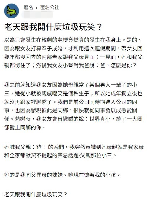 原PO自己都難以置信,以為只會發生在韓劇的老梗,卻真實上演!「你們想笑我、酸我,我都不在乎,畢竟要是我看到這樣的事,也會覺得真的好假,像我可悲的家庭和愛情一樣,只想問怎麼做才能全劇終?」