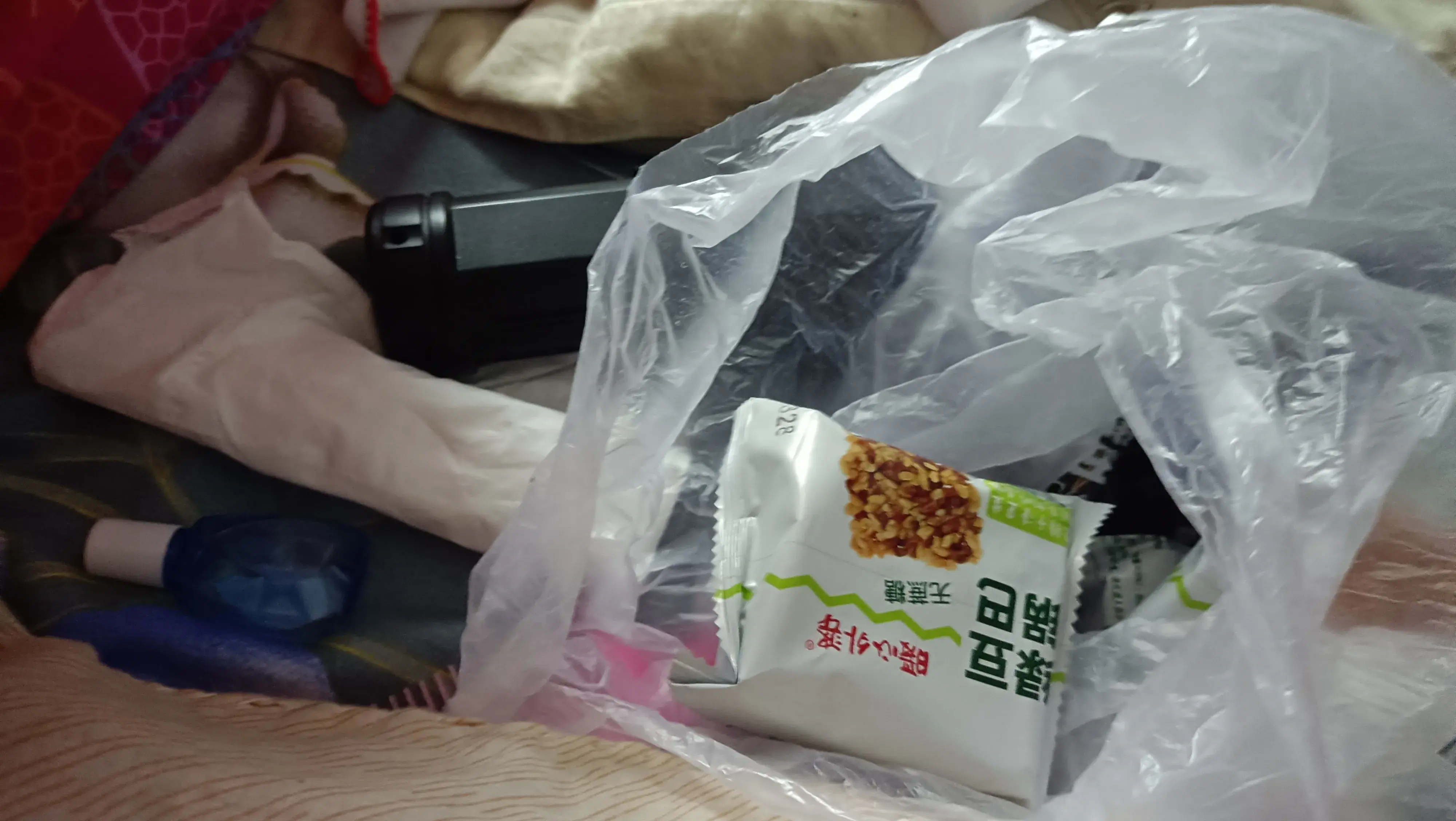 枕頭邊上有小毛巾,有葯,有紙巾,有眼藥水,有吃的,有梳子,有手電筒,有手機,有充電器,亂七八糟一大堆堆在一起,也不怕影響了自己睡覺,感覺整個床比流浪漢的都不如!