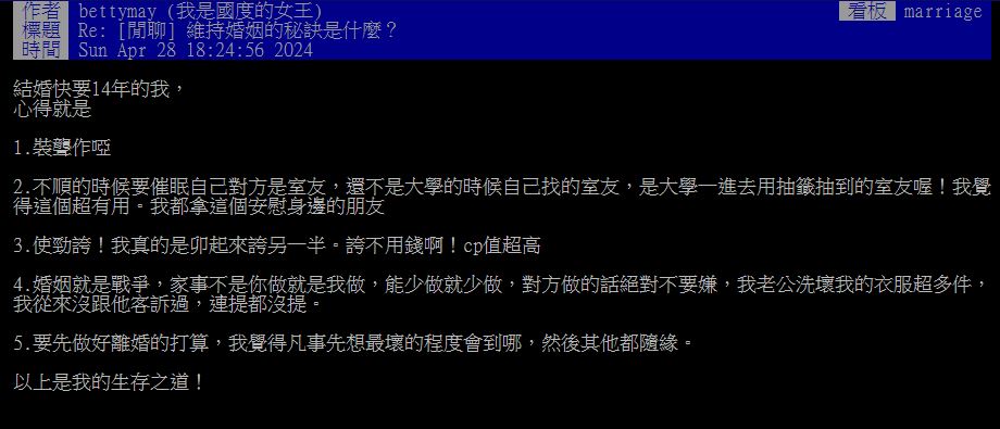 其他網友則表示,很多人都是湊合著過,女生還是得有獨立經濟能力,別依賴另一半生存,「結婚15年,強力支持妳的第5點,做好離婚準備,在他幹蠢事時,才不會產生『我要跟這個人過一輩子』的恐懼,也會把重心放在自己身上。」、「湊合結婚的夫妻多了去了,也不是試著磨合就有成果,當然只能部分就算了、當沒事就好。」