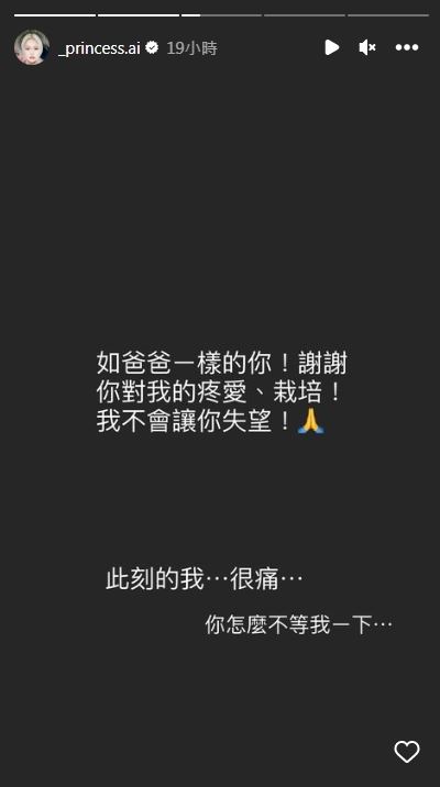 至於過去由他一手捧紅的44歲戴愛玲,也立刻取消整天工作,並在限動上發文哀嘆,「如爸爸一樣的你,謝謝你對我的疼愛、栽培,我不會讓你失望,此刻的我⋯很痛⋯你怎麼不等我一下」。