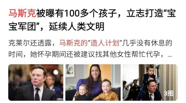 除了趙萬龍,別忘了還有世界首富馬斯克,也是個生娃狂魔。除了有錢,他還常年派人到處找高質量女性,跟他一塊生孩子,對他而言,除了追求事業成功、人生幸福,還要盡量延續血脈,把自己的基因長久傳承下去,至於外界看法為何,就見仁見智了。