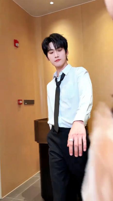 他上身穿著一件很普通的白色襯衫,衣擺扎在了黑色的西裝褲裡,顯得腿特別的長。