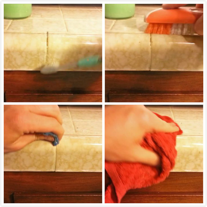 第四步,用牙刷蘸上少許的溶液后在縫隙上來回擦洗,當縫隙足夠濕潤之後換成板刷以及百潔布進行擦洗。擦洗完之後用乾淨的抹布擦拭乾凈。