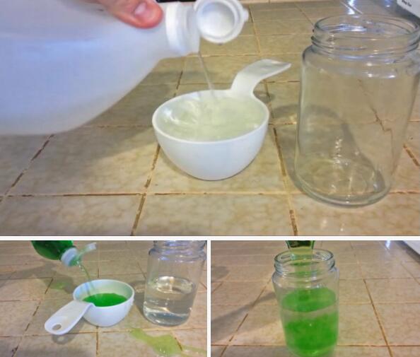 第二步,在一個耐熱的玻璃容器里倒入一杯白醋以及半杯洗潔精混合均勻。