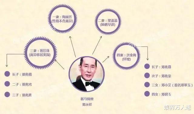 鄧兆尊一生衣食無憂但選擇不婚不育很有可能受到上一輩人的影響,因為鄧兆尊的爺爺就有4任妻子,他的爸爸鄧永祥一生也有4任妻子,他此前還和自己親生母親洪金梅爭奪父親的遺產多年,弄得家無寧日。