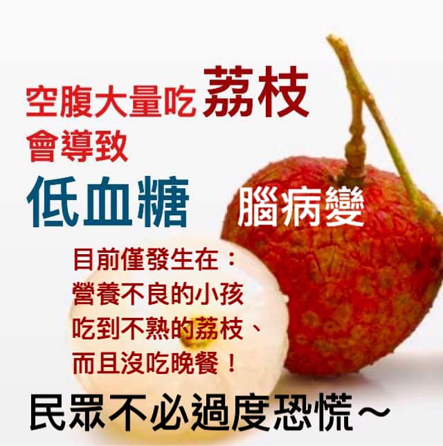 他解釋說,荔枝含有抑制人體生成葡萄糖的毒素,營養不良的小孩在空腹時大量食用,又沒吃晚餐,就會發生低血糖昏迷、腦病變,甚至喪命,但以上這些要素要同時發生,其實機率很低,所以平常食用時,特別留心就可以了。