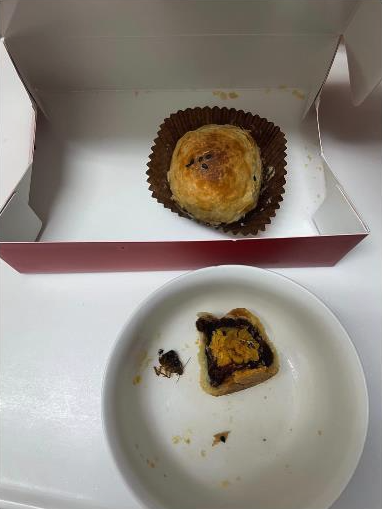 根據《TVBS》報導,昨(11)日有網友在臉書社團「爆料公社二社」控訴:「超噁心~不二糕餅店蛋黃酥中間,竟然有蟑螂!」透露自己買了蛋黃酥給長輩吃,結果對方吃到一半感覺怪怪的,一看異物被嚇壞,竟然吃到蟑螂,令人毛骨悚然的是,只剩一半蟑螂身體,驚呼:「可能代表另外一半蟑螂已經被吃下肚......」