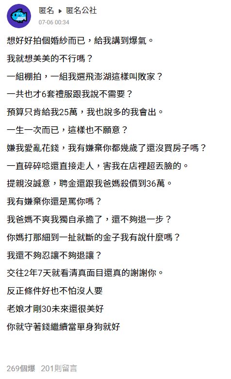 最後不忘嗆對方一句:「老娘才剛30未來還很美好,反正條件好也不怕沒人要,你就守著錢繼續當單身狗就好。」對此,上百網友都傻眼回:「我有一百萬也不敢娶妳這種女人。」、「我當初也沒拍!也沒拿男方聘金,而且直接公證!」、「恭喜,有個男人脫離苦海了。」、「25萬的婚紗貴貴的呀...」、「其實婚紗照到最後都不會看,妳只是虛榮心作祟。」