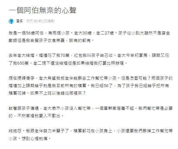 「小孩還要我們辭掉工作幫他帶,想到心裡就痛!」原PO也表示,目前老二尚未結婚買房,自己和老伴仍有約900萬存款。貼文一出,將近五百位網友紛紛湧入留言:「他是單薪,又不是單親,配偶是死了嗎?」、「請你硬起來,該拒絕就拒絕,您是他父親,不是免費保母,不可能照顧巨嬰一輩子,另一個兒子結婚或懷孕也要,您一碗水能端平?」
